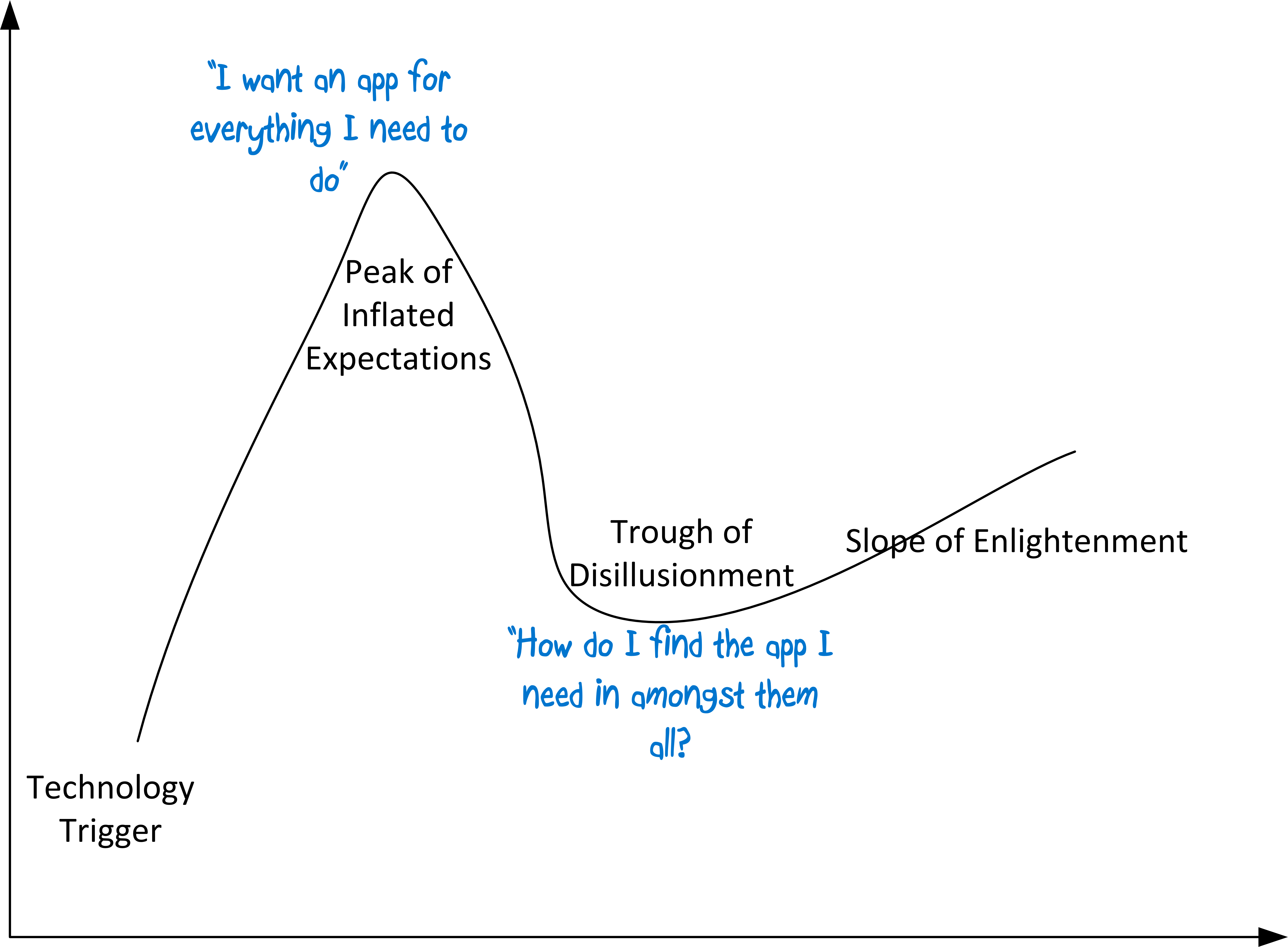 Right now an organisation may find that consumers of its IT want access to just one or two functions via an app, and perhaps 10 apps will be created for 10 different functions. (By function I do mean one type of interaction with some back end technology, whatever that may be, perhaps searching for client information. I don’t mean the “Sales” function or other such organisation.) And that sort of thing is proliferating, so perhaps we’re somewhere between the “Technology Trigger” and “Peak of Inflated Expectations” with lots of these new apps being developed.